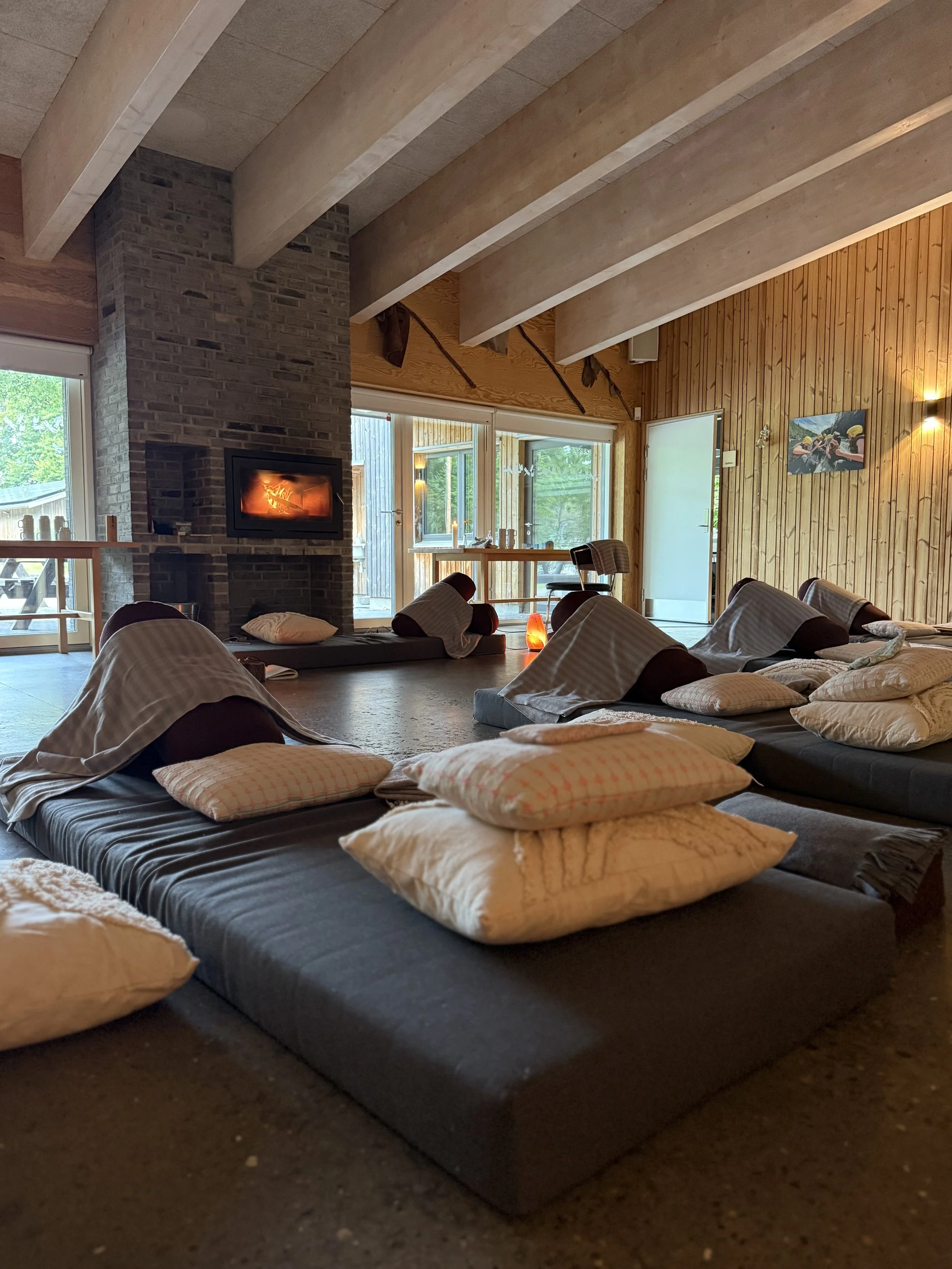 Undervejs overgiver vi os til helende hvile i form af restorative stillinger, hvor kroppen støttes af puder og tæpper. Her får kroppen lov til at hvile i dybden og aktivere sin naturlige evne til at hele og genopbygge sig selv.